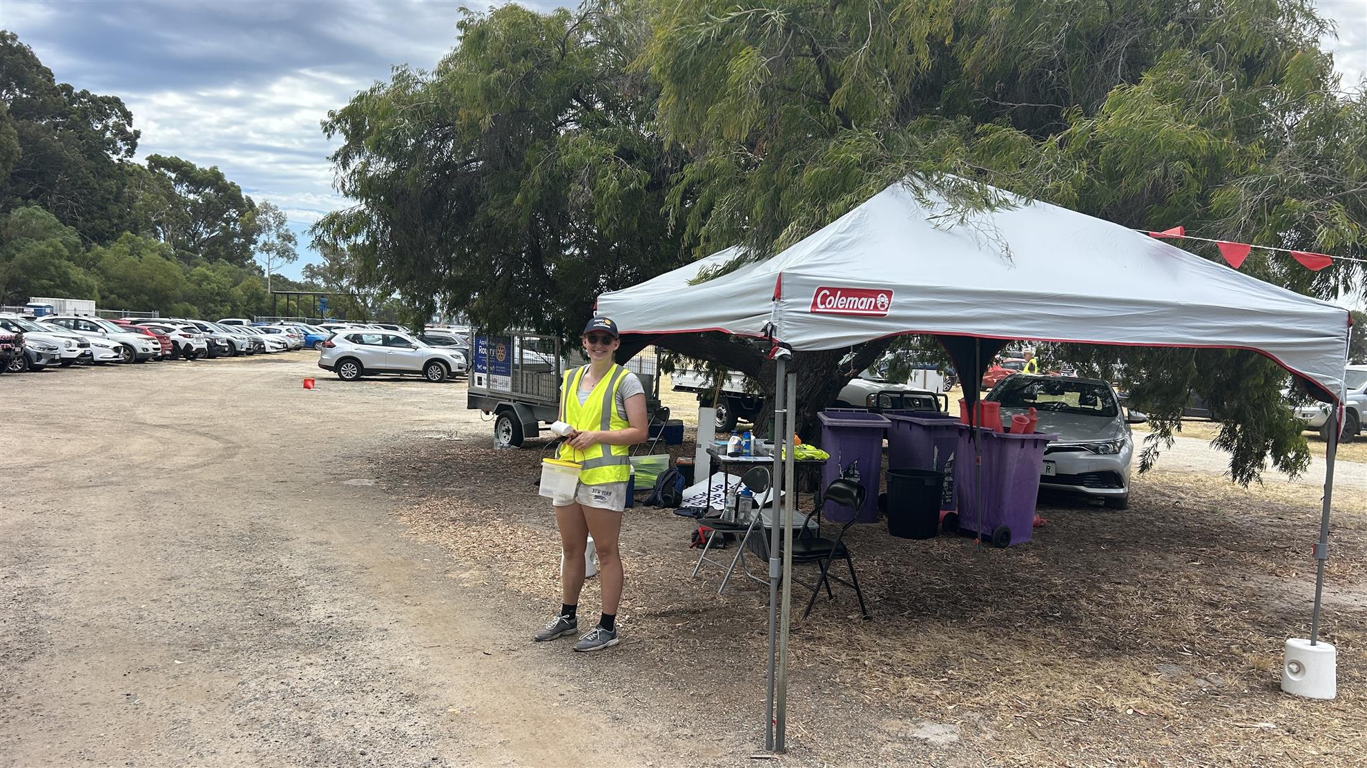 In preparation for the extreme conditions, generous support from Mal Taylor saw two gazebos donated, providing much-needed shade for our donation collectors in the lower car park. An umbrella was organised for the entrance position; however, a missing part meant the morning shift (Barry Mendelawitz) missed out on shade, while the afternoon shift (Tony Haeusler) was able to benefit.